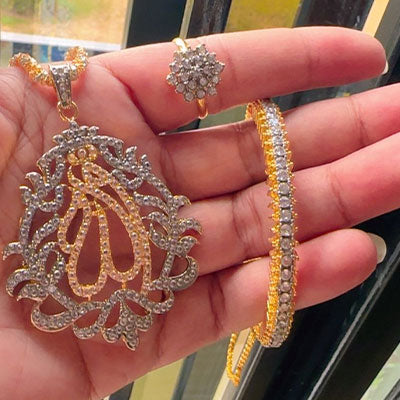 Allah Locket with Diamond Cut Ring and Fariha Kangan is a stunning jewelry set that combines elegance, spirituality, and traditional craftsmanship for a complete festive or bridal look.