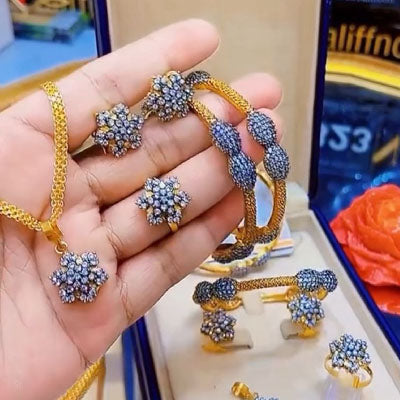 This elegant New Sona Polish Kera set is beautifully crafted with a rich, long-lasting gold polish that gives it a luxurious traditional shine. The design is enhanced with ruby and emerald stones, adding vibrant color and a premium finishing touch. Perfect for weddings, parties, and festive wear, this set combines classic style with eye-catching detailing, making it an ideal choice for those who love refined, timeless jewelry.