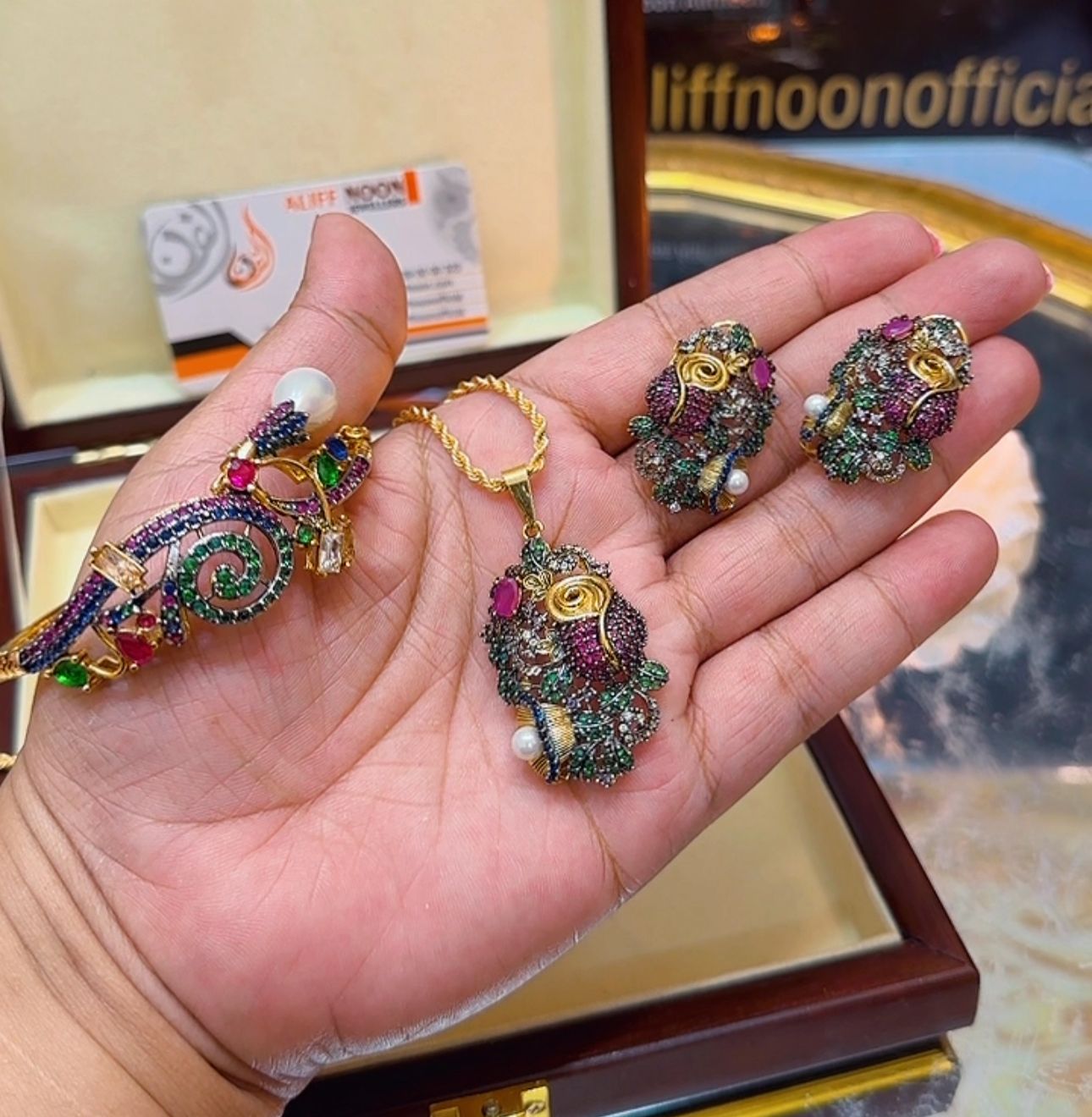 The Pearl Peacock 3D Diamond Cut Set is a stunning jewelry set inspired by the elegance of peacock motifs and the timeless beauty of pearls. Crafted with fine metal and finished in a radiant diamond-cut polish, this set features a 3D peacock design enhanced with graceful pearls that add a royal and feminine touch. Perfect for weddings, festive events, and special occasions, this set brings traditional charm with a luxurious modern feel.